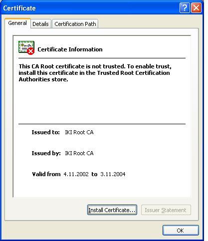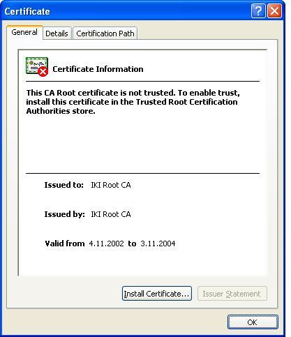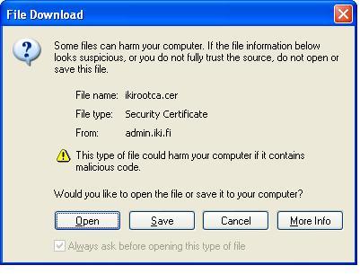 Kun lataus on päättynyt kertoo selain sinulle että kyseessä on varmenne ja ilmoittaa että se ei ole vielä luotettu. Valitse tästä ruudusta "Install Certificate...".