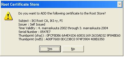 Lopulta wizardi kysyy haluatko lisätä varmenteen "Root Certificate Storeen". Vastaa tähän "Yes".
