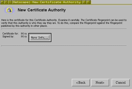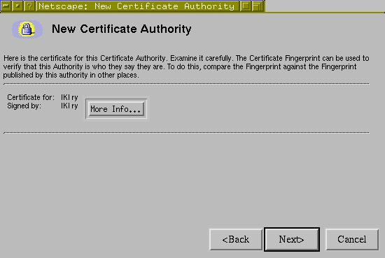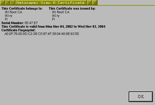 Seuraavassa ruudussa kerrotaan että kyseessä on IKI ry:n varmenne ja painamalla "More Info..." tekstiä saa esille lisää tietoa varmenteesta.
