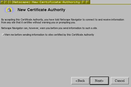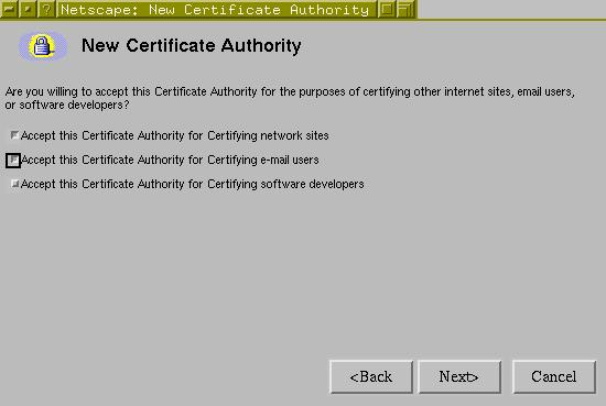Nyt esiin tulee sivu jossa kysytään millaisissa asioissa kyseeseen varmenteeseen voi luottaa. Tästä ruudusta pitää rastittaa vähintään "Accept this Certificate Authority for Certifying network sites". Mikäli käytät samaa selainta myös postin lukemiseen niin kannattaa myös rastittaa "Accept this Certificate Authority for Certifying e-mail users". IKI:llä ei ole suunnitelmissa ryhtyä allekirjoittamaan koodia, joten tuo viimeinen kohta kannattaa jättää valitsematta. Sen jälkeen vain painat "Next".