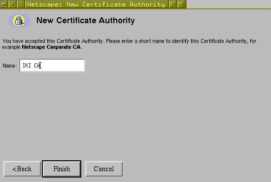 Viimeisenä kysytään sitten vielä jonkinlainen nimi varmenteelle. Nimellä ei sinänsä ole väliä, mutta siihen kannattaa laittaa jotain sellaista josta tunnistat varmenteen. Esim "IKI CA".