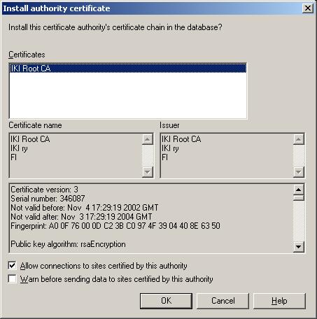 Tällä sivulla siis kysytään millaisissa asioissa kyseeseen varmenteeseen voi luottaa. Tästä ruudusta pitää varmistaa että tuo "Allow connections to sites certified by this authority" on valittu ja että "Fingerprint" (MD5) on oikea. Asennus tehdään loppuun painamalla "OK".